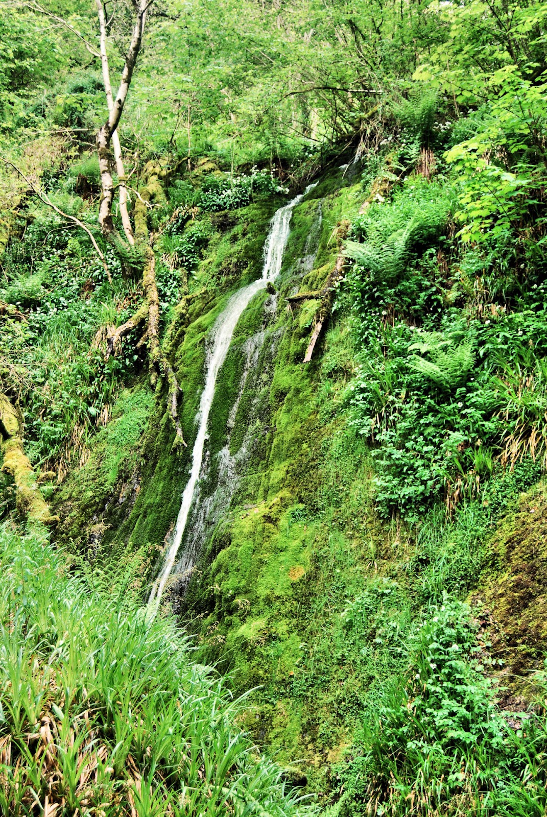 I took a path the northern side of the valley, towards Leighland Chapel. Either side were borders of bluebells and white wild garlic flowers. Looking down I got a clear view of Comberow with the farm buildings and a line of trees giving away the position of the Incline. At a junction I took a path that almost doubled back and went towards the head of the valley. The path did not fall much, but the gradient of the watercourse meant that it converged with the stream. The valley's sides are steep and wooded with some parts of its floor occupied by meadows. Suddenly though, the head of the valley is reached and there is an abrupt change in slope. I followed a fairly steep path, passing some moss and fern covered rock outcrops and eventually reached a wider track that bordered the woodland. This followed the contour around a tributary valley. I soon passed an uninhabited house that, although delapidated, still had its roof just about intact. I think that this is the same house that is pictured on